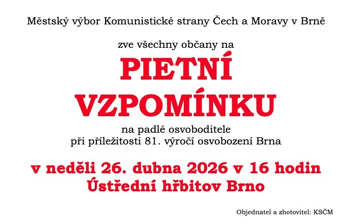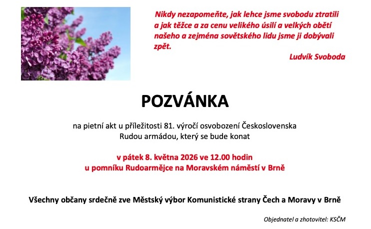 PIETNÍ AKT U PŘÍLEŽITOSTI 81. VÝROČÍ OSVOBOZENÍ – 8. května ve 12 hod. u pomníku Rudoarmějce na Moravském náměstí v Brně.